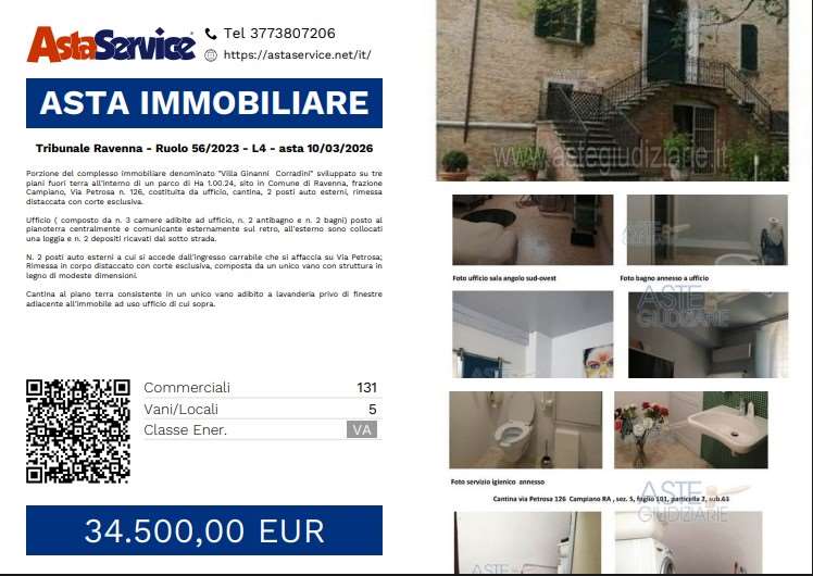 Immobilimpresa 10796150 – Riferimento Agenzia Tribunale Raven – Porzione del complesso immobiliare denominato "Villa Ginanni Corradini" sviluppato su tre piani fuori terra all'interno di un parco di Ha 1.00.24, sito in Comune di Ravenna, frazione Campia... Vedi di più