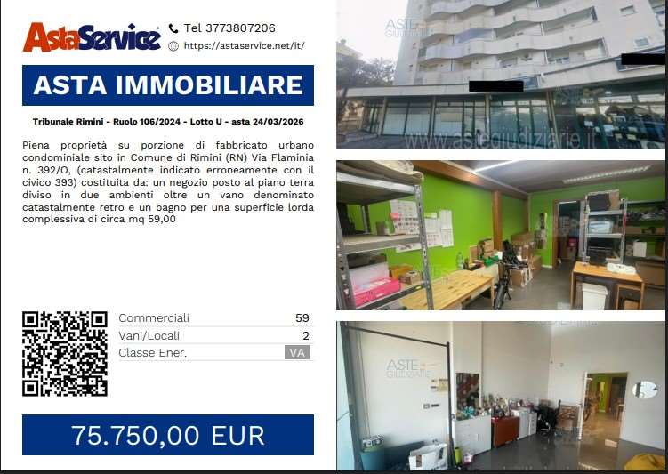 Immobilimpresa 10942679 – Riferimento Agenzia Tribunale Rimin – Piena proprietà su porzione di fabbricato urbano condominiale sito in Comune di Rimini (RN) Via Flaminia n. 392/O, (catastalmente indicato erroneamente con il civico 393) costituita da: un ... Vedi di più